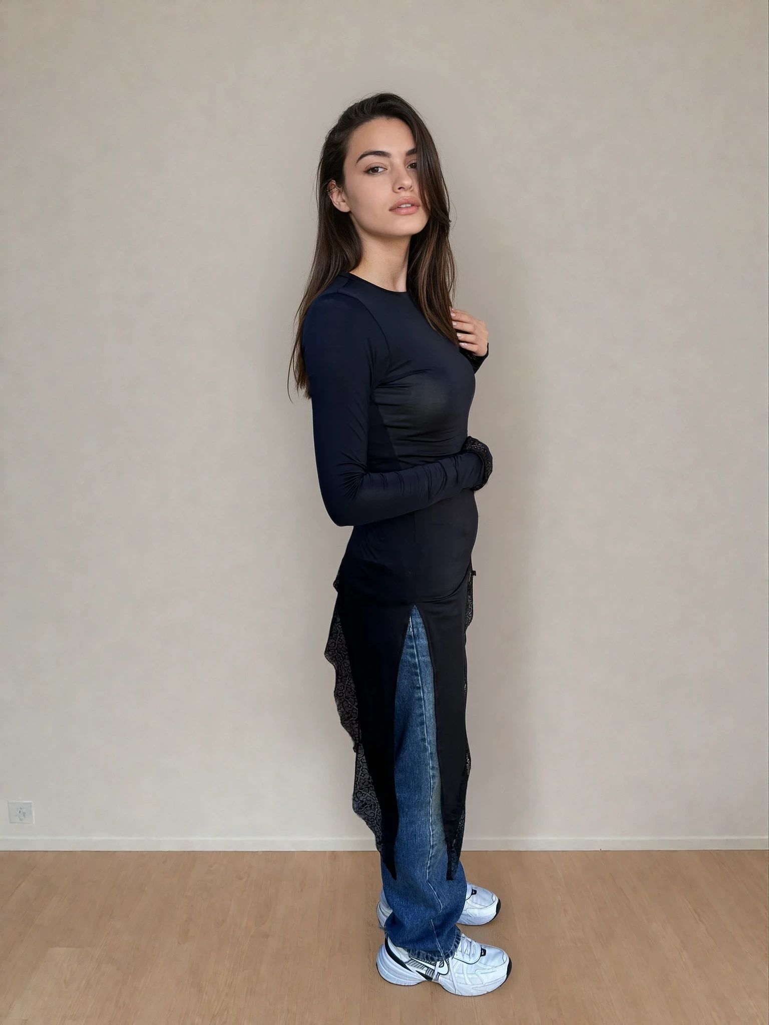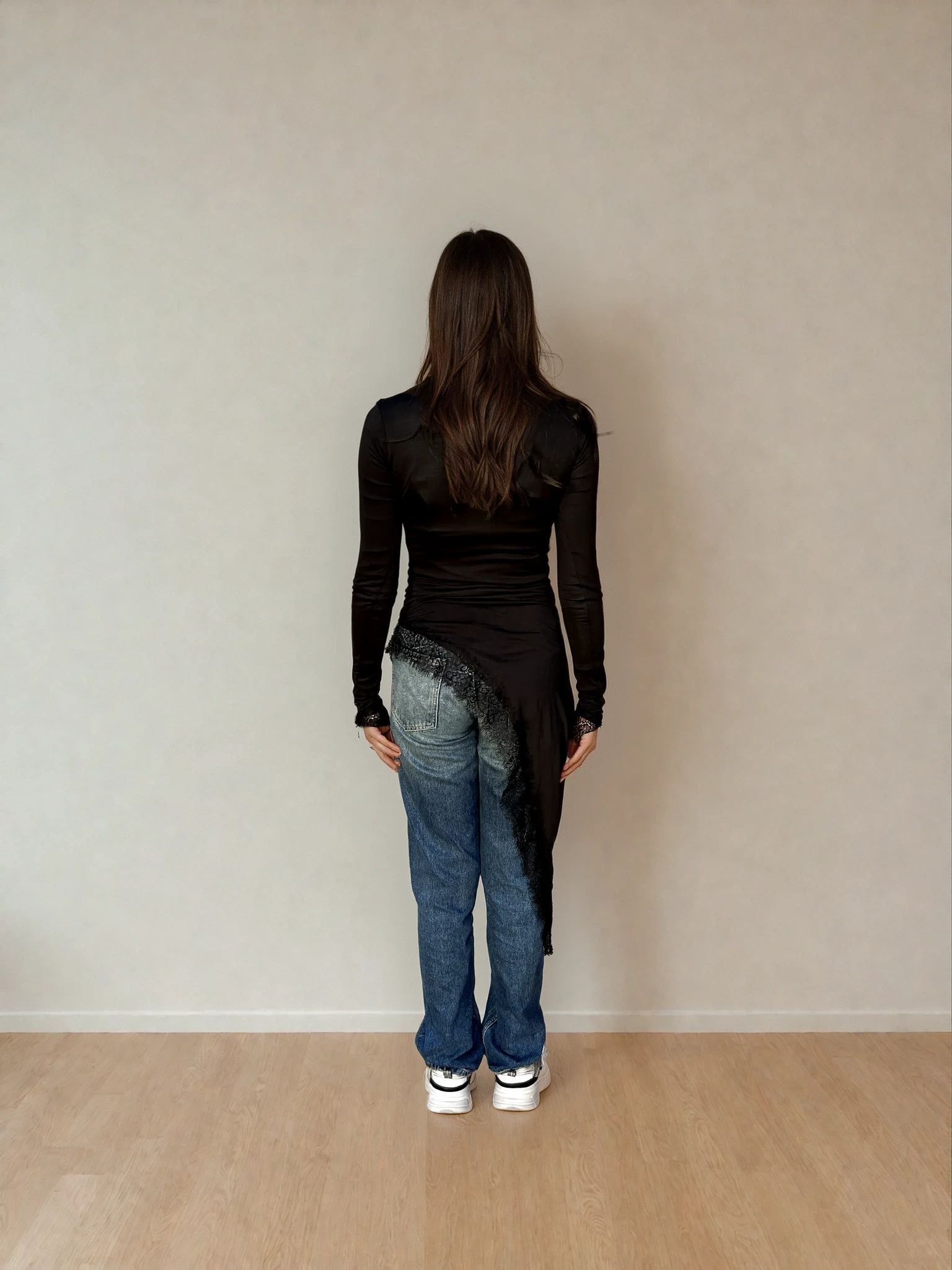 A sleek, body-contouring black top with delicate lace detailing for a refined, feminine touch.